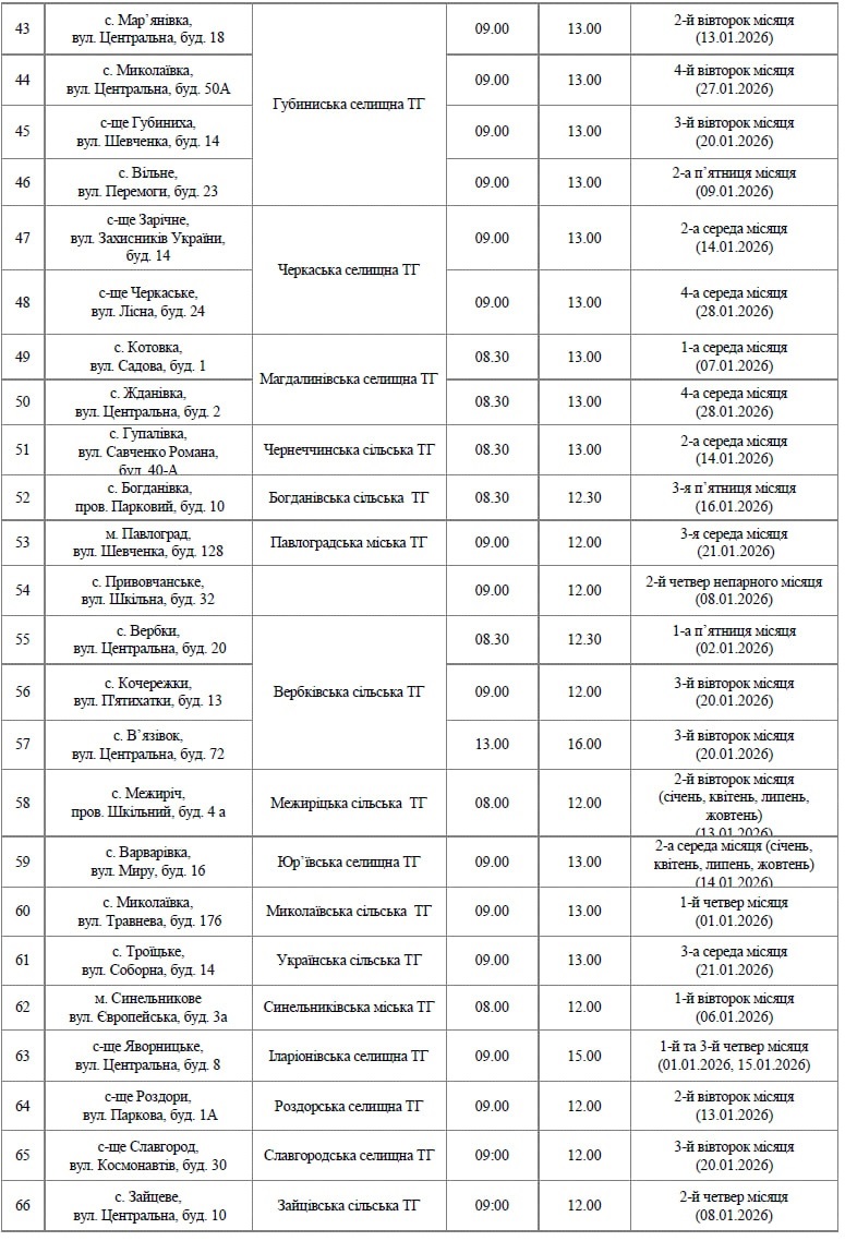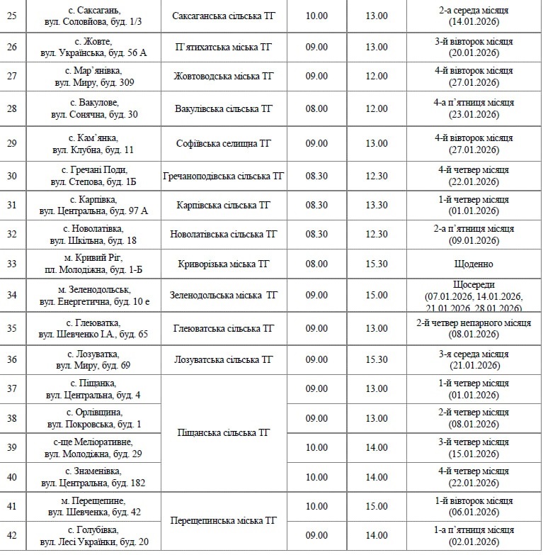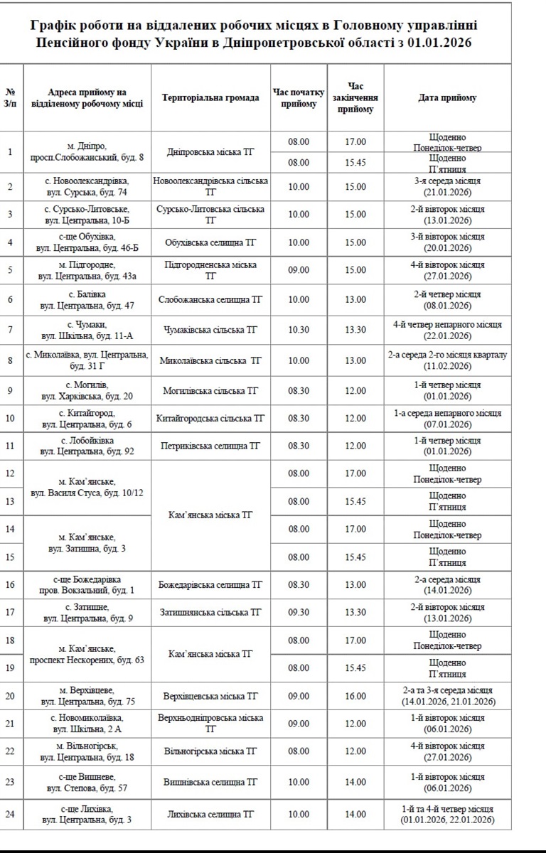 Графік роботи на віддалених робочих місцях в Головному управлінні Пенсійного фонду України в Дніпропетровської області з 01.01.2026